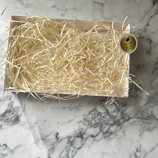 This sturdy presentation box has a crisp white base with a clear lid so your personalised chocolate design stays fully visible while protected. Your slab sits neatly on a bed of cream shred for a beautiful, professional finish.